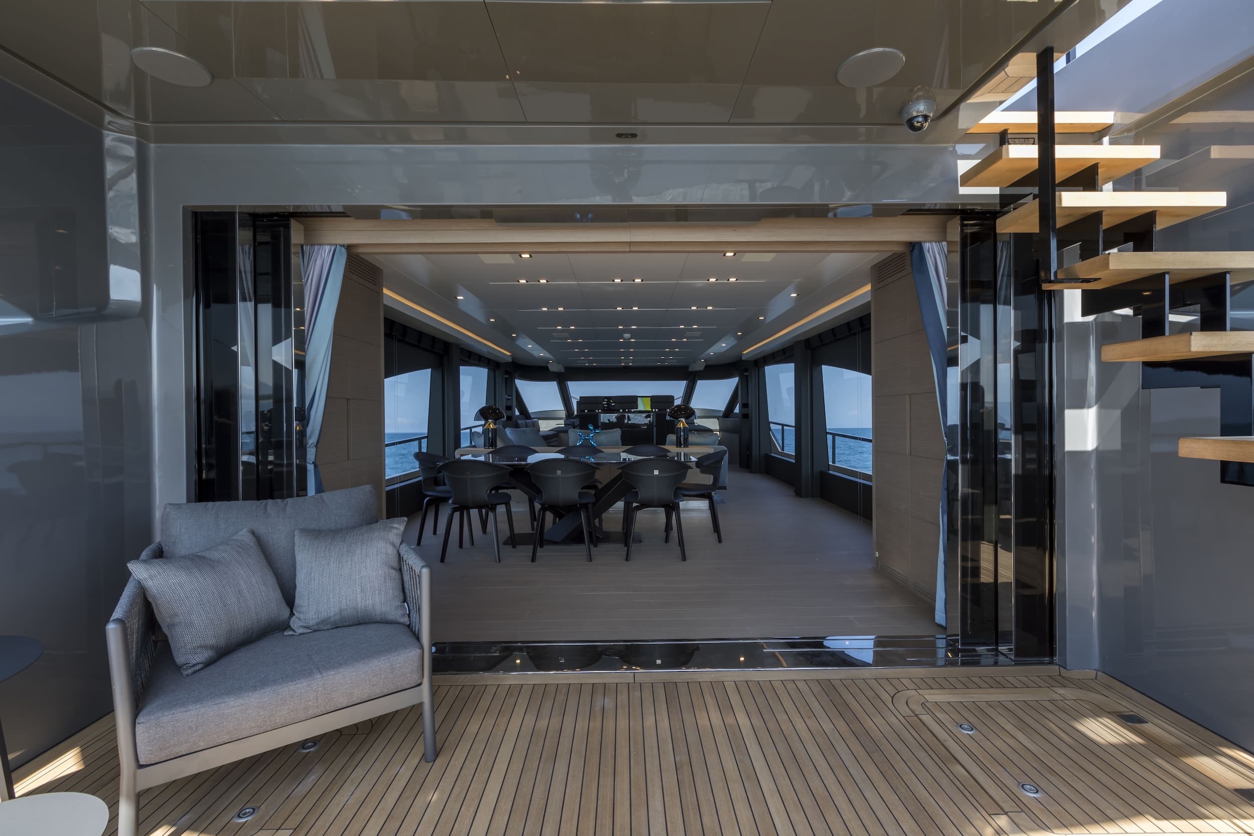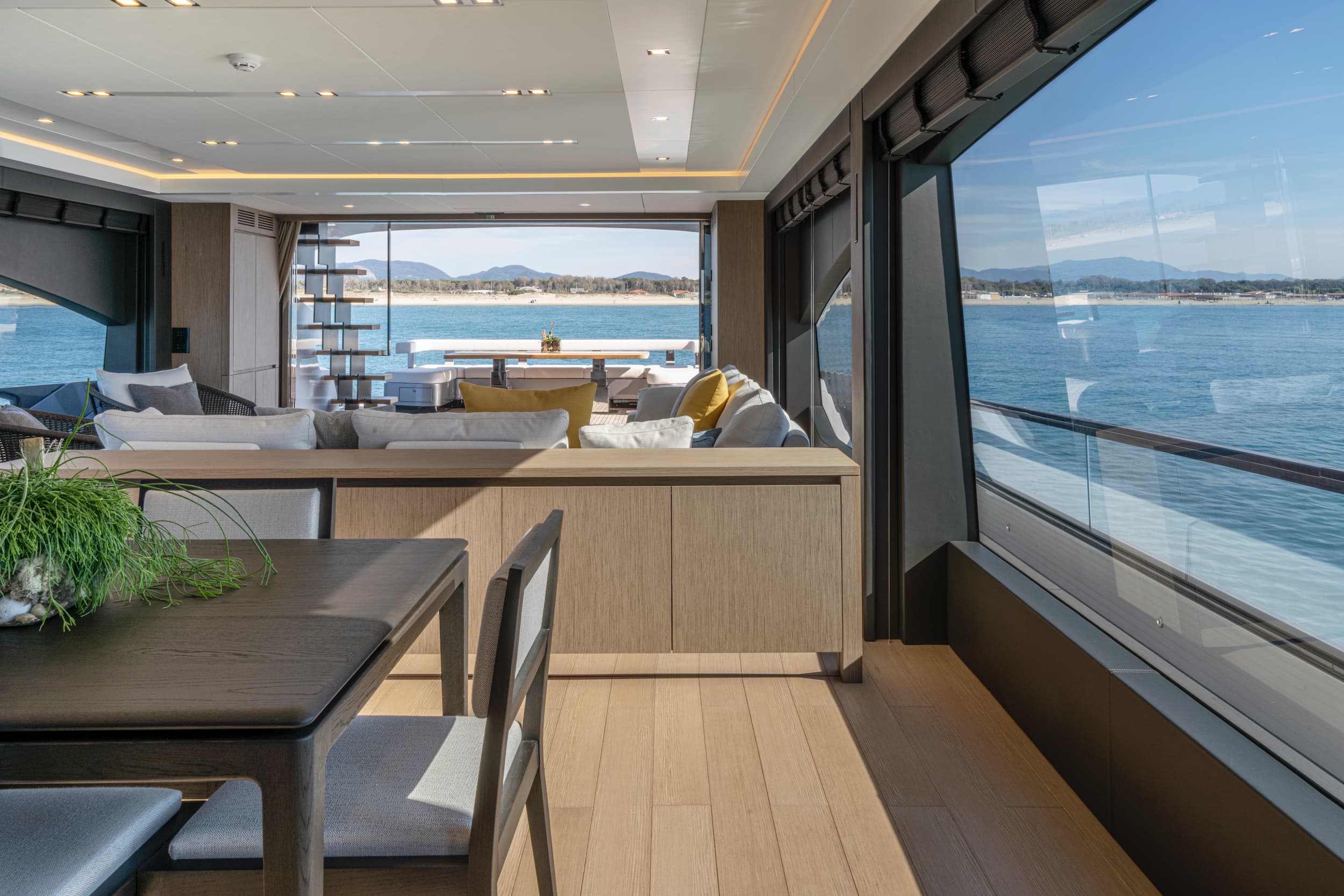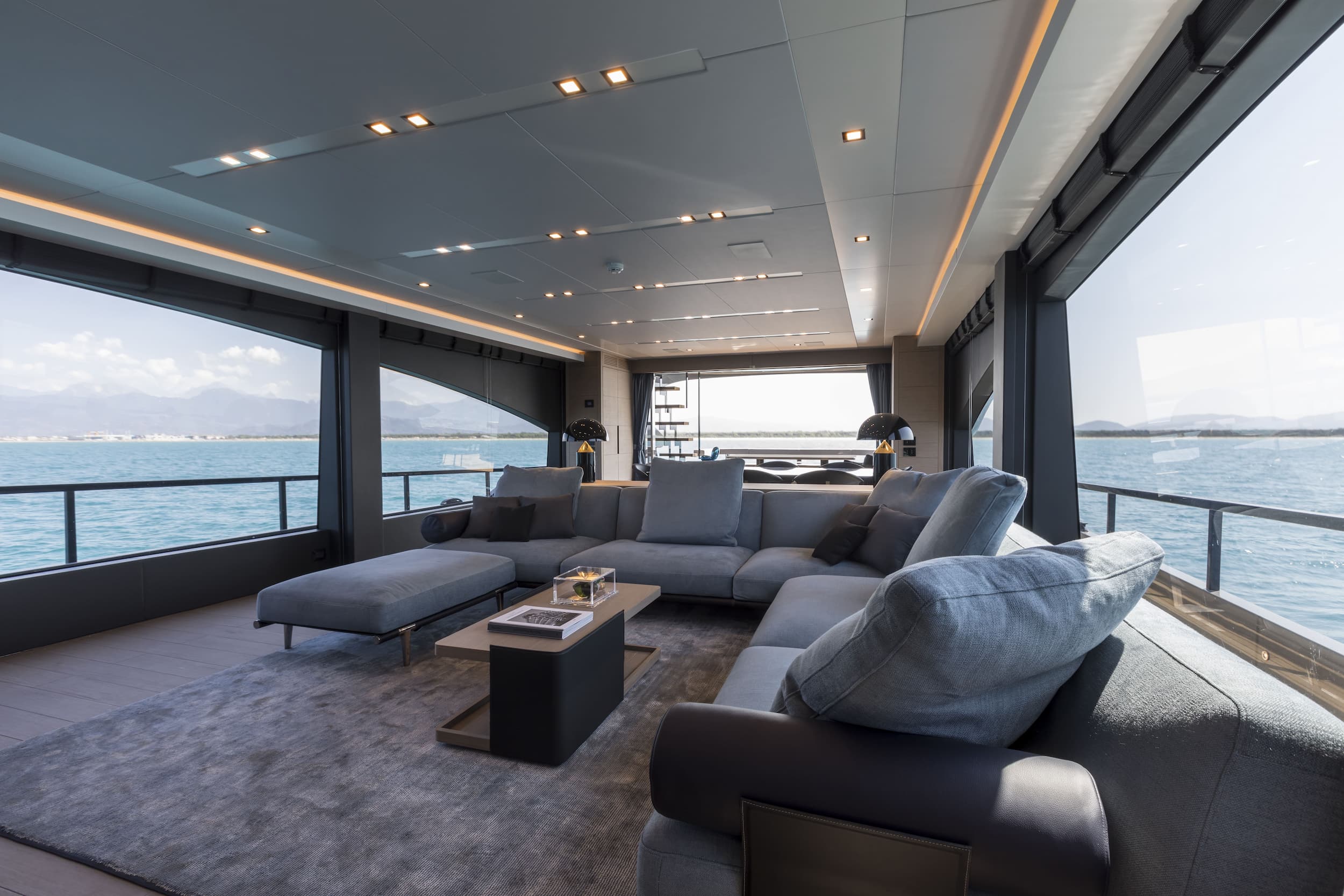 The AB 100 blurs the line between indoors and out. Her saloon flows directly onto the aft deck with no steps, and a concealed sliding door enhances the connection between interior and exterior. Together, they create a seamless social space for entertaining or unwinding at sea. Floor-to-ceiling windows and a retractable hardtop flood the interior with light, while the helm opens to the sky at the touch of a button. Whether you're cruising fast or anchored in still water, the space is designed for quiet mornings, shared exhilaration, and open-air dinners under the stars.