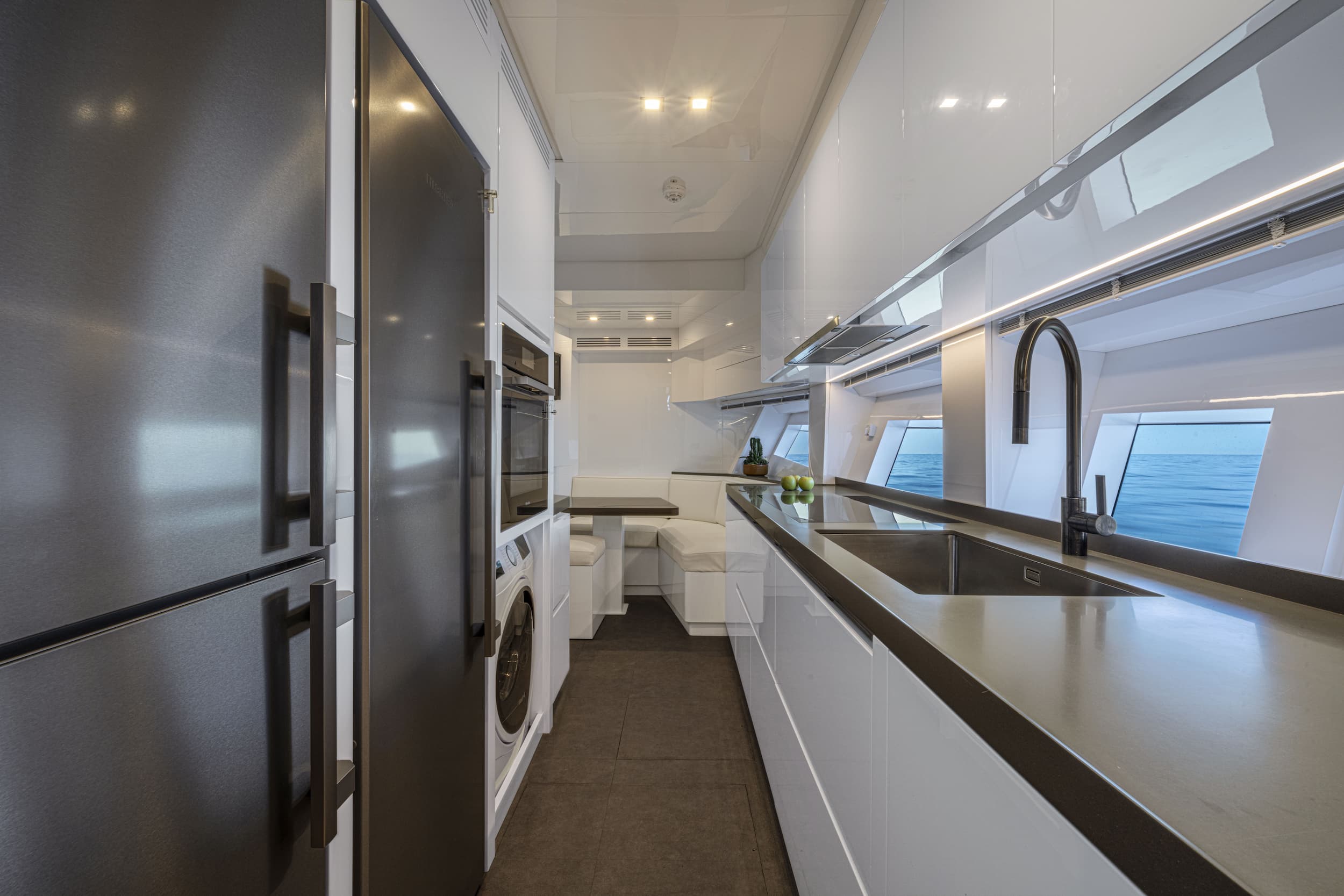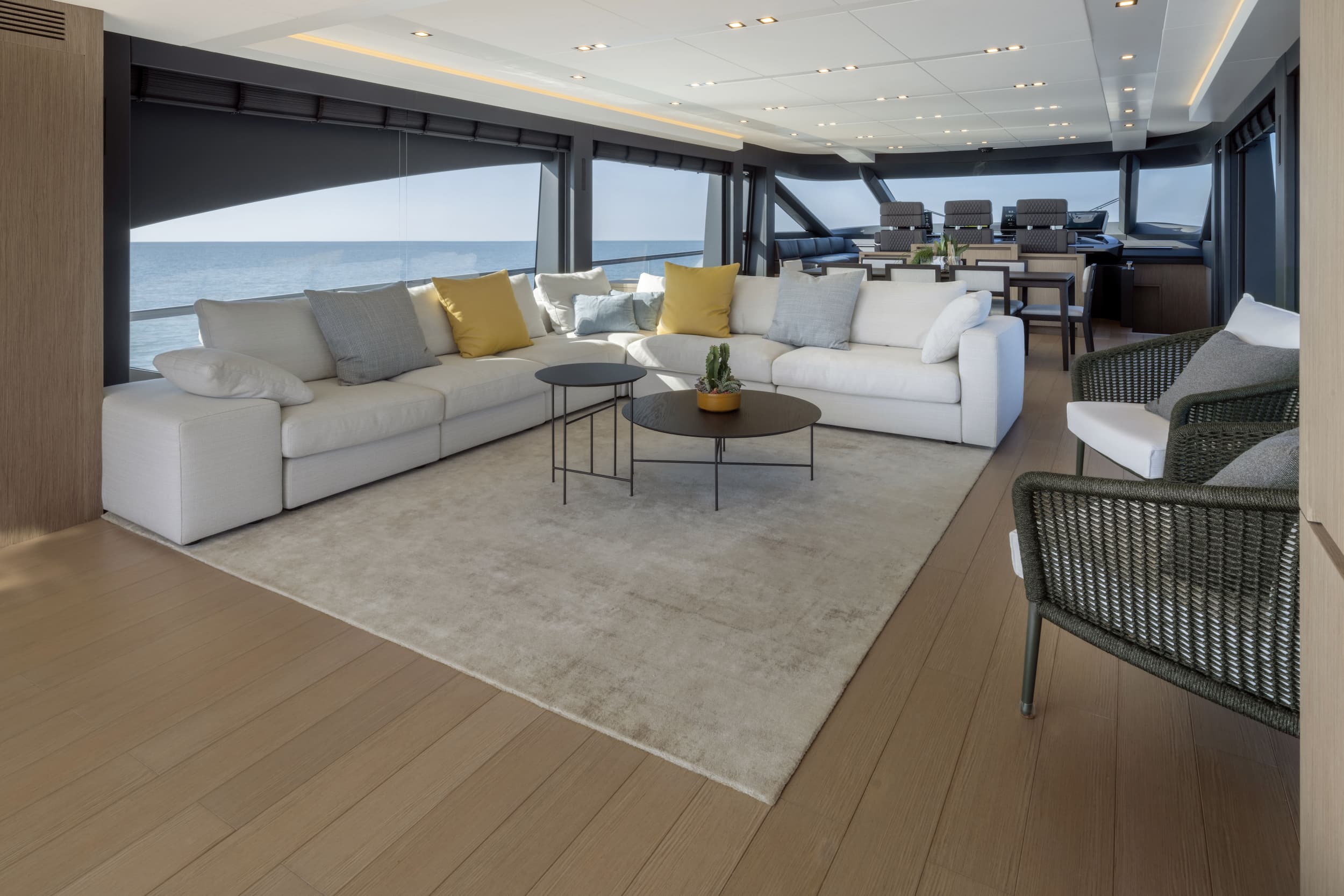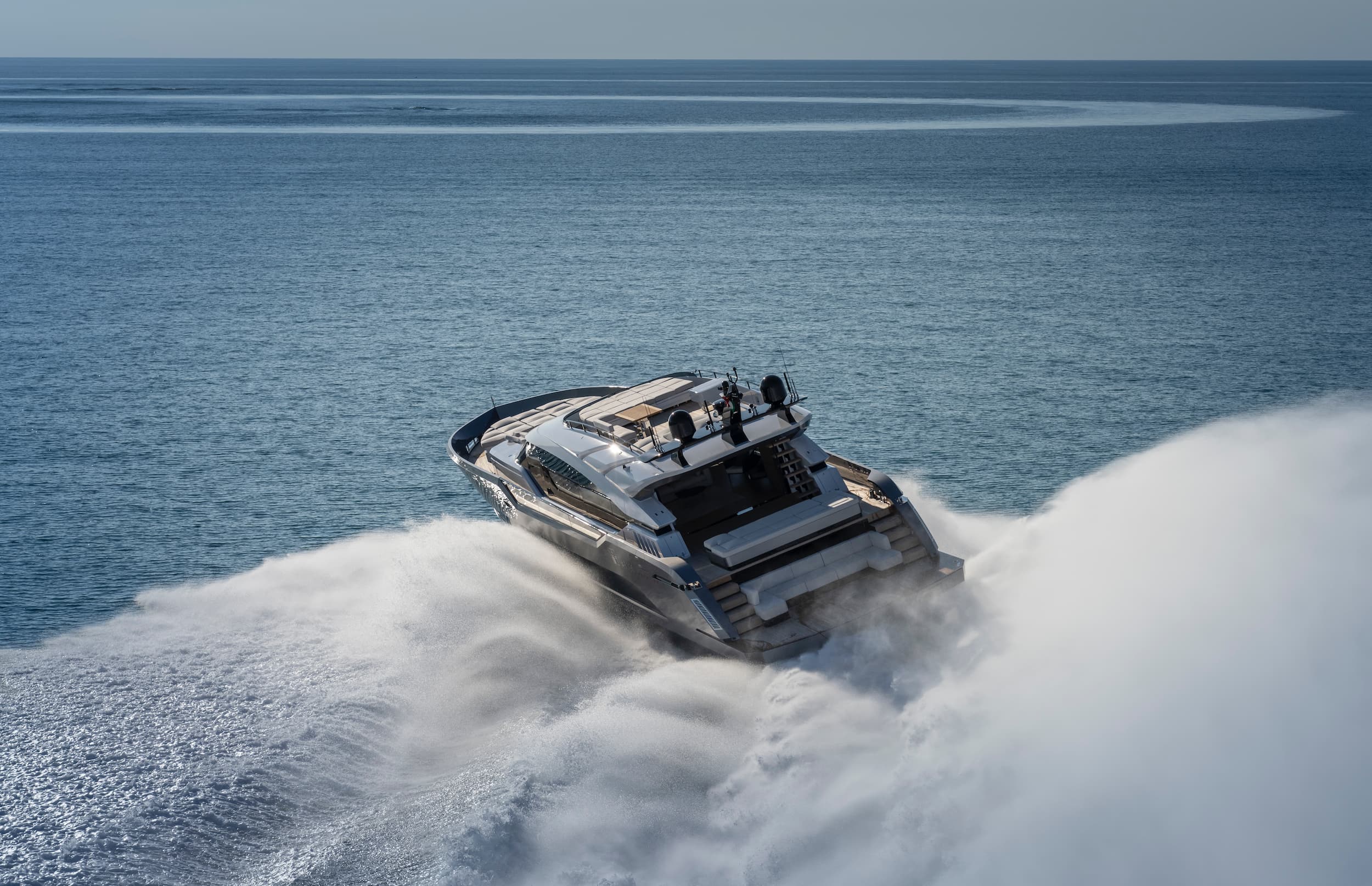 The AB 100 blurs the line between indoors and out. Her saloon flows directly onto the aft deck with no steps, and a concealed sliding door enhances the connection between interior and exterior. Together, they create a seamless social space for entertaining or unwinding at sea. Floor-to-ceiling windows and a retractable hardtop flood the interior with light, while the helm opens to the sky at the touch of a button. Whether you're cruising fast or anchored in still water, the space is designed for quiet mornings, shared exhilaration, and open-air dinners under the stars.