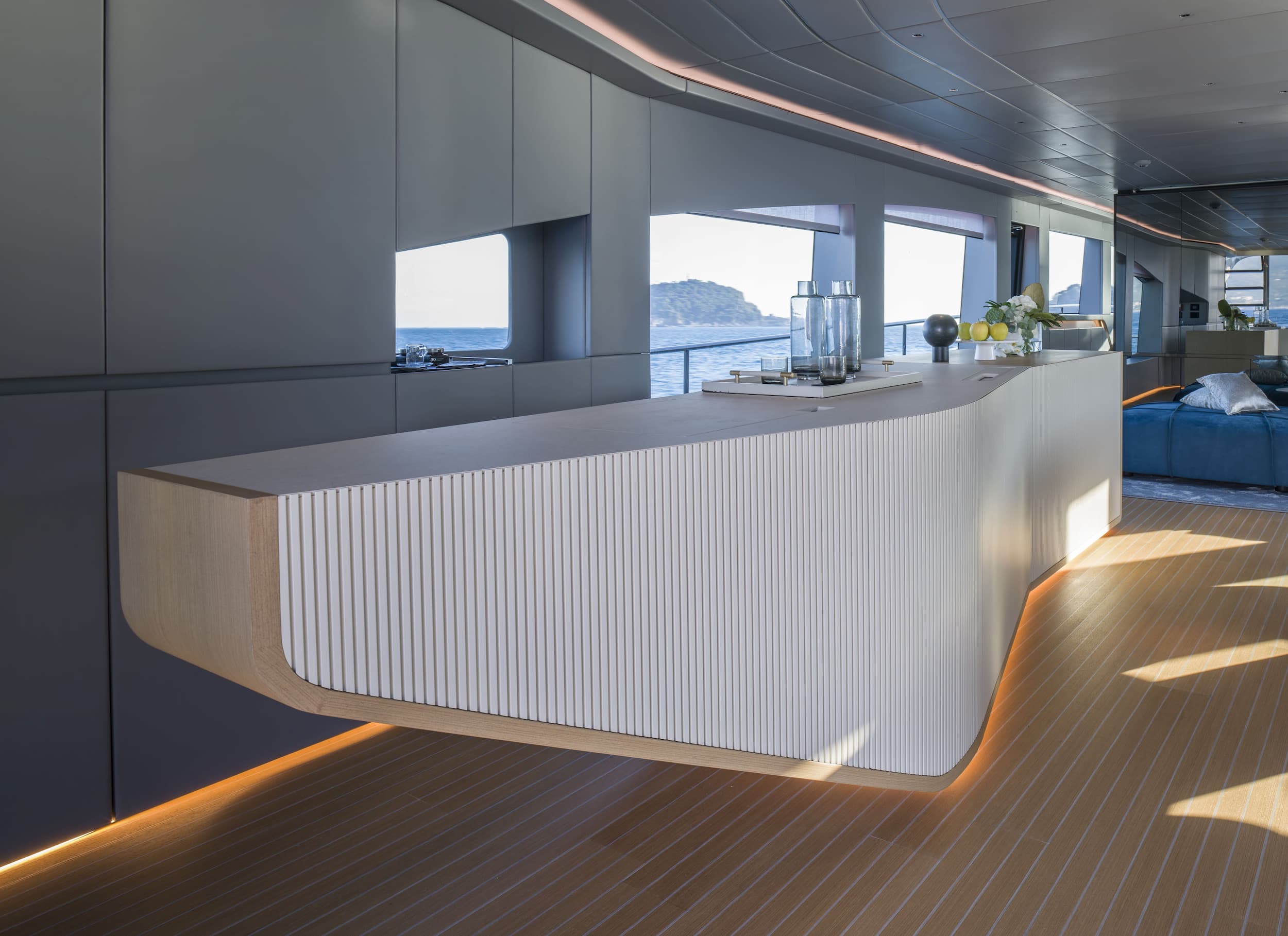 Thanks to her shallow draught and clever engineering, the AB 110 gets you closer to the shore. The aft transforms into an elegant beach club, complete with a raised platform system, seamless tender access, and discreet storage for all your water toys. Whether you're stepping straight into the sea or unwinding on deck with a view, everything is ready the moment you arrive.