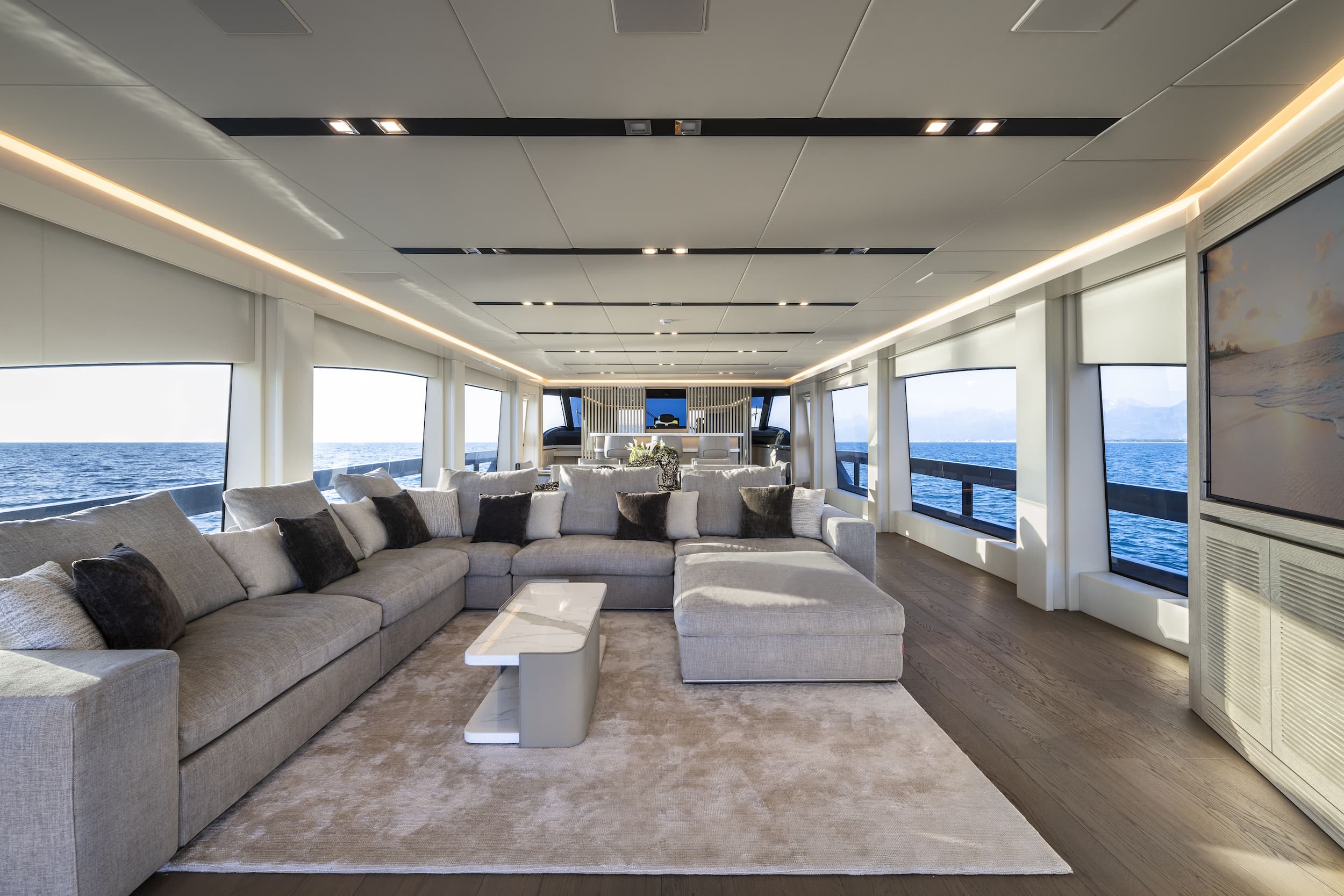 The AB 130 features one of the most impressive beach areas in her class. A sea-view pool sits at the centre of the aft deck, flanked by two fold-out terraces that extend the lounging space into a full open-air resort. With direct access to the water, elegant sunbathing zones, and spa-style showers, this is your own private retreat at sea — spacious, serene, and seamlessly integrated into the yacht’s design.